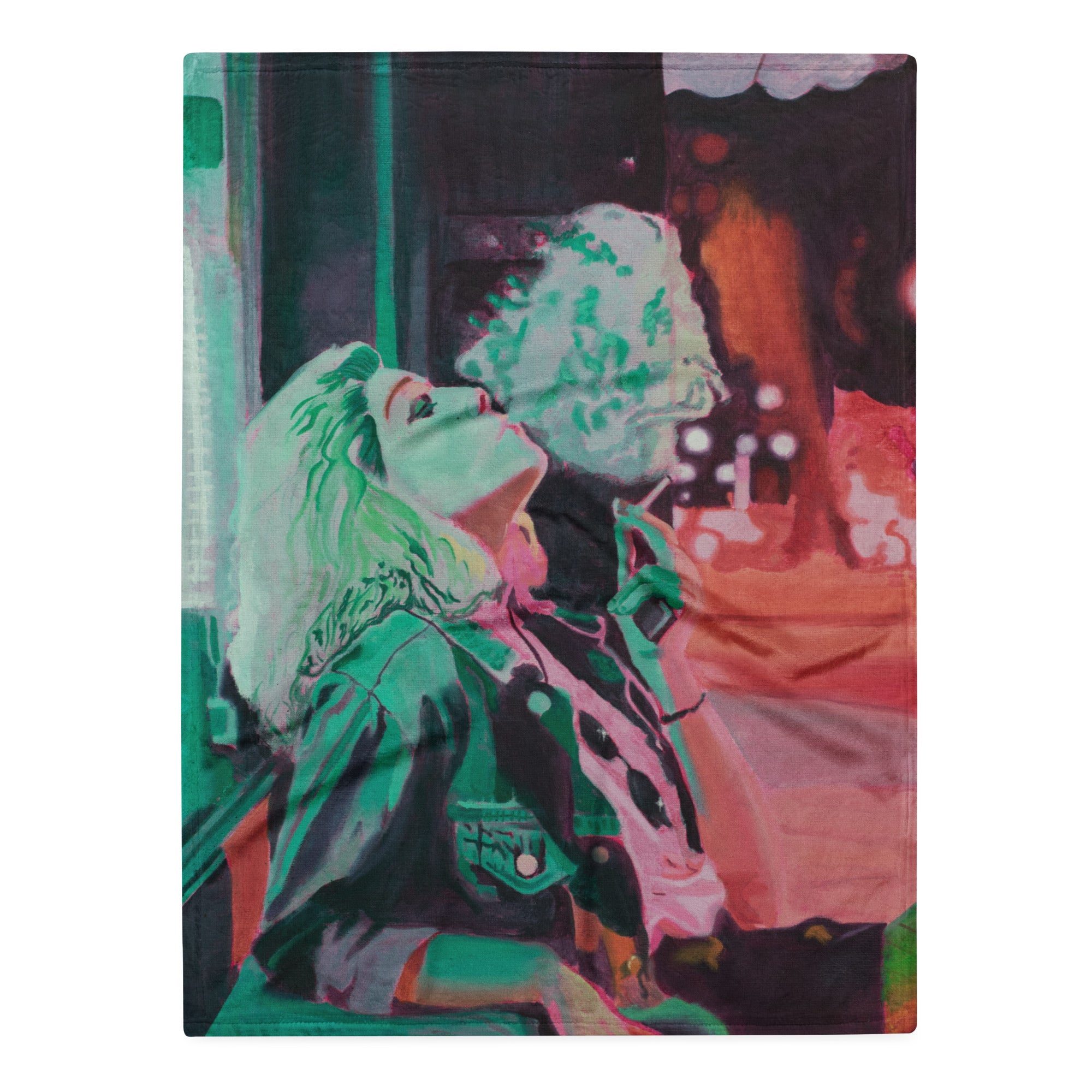 Wrap yourself in the glow of neon nights and quiet rebellion. This throw blanket features a vivid, painterly scene of a woman exhaling a cloud of smoke beneath electric city lights—an intimate moment suspended between motion and stillness. Saturated greens, blush pinks, and warm reds blur together like a half-remembered memory, evoking late nights, restlessness, and unapologetic solitude.