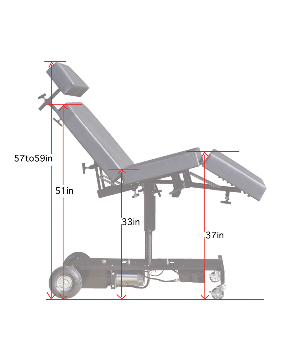ADJUSTABLE DESIGN - The Chariot Tattoo Chair boasts impressive adjustability. Measuring 65’’L x 24’’W x 24''H, its height can be easily modified up to 33'' to suit various client needs and treatment requirements. Additionally, the backrest tilts up , allowing for customized positioning that maximizes comfort and support.